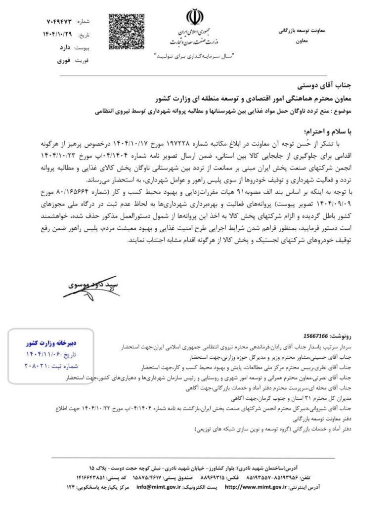 در واکنش به این نامه، «موسوی» معاون توسعه بازرگانی وزارت صنعت، معدن و تجارت طی نامه‌ای به «دوستی» معاون هماهنگی امور اقتصادی وزارت کشور، خواستار ورود این وزارتخانه به این مساله شد. وزارت کشور نیز در پی این پیگیری، با صدور نامه ای به مورخ ۲۵ بهمن‌ماه ۱۴۰۴، خطاب به سردار سرتیپ حسینی، رئیس پلیس راهور فراجا، با اشاره به مفاد قانون تسهیل صدور مجوزهای کسب و کار و بند الف مصوبه ۹۱ هیأت مقررات‌زدایی، تأکید کرد که دریافت پروانه تردد و فعالیت از شهرداری‌ها برای تردد بین‌شهرستانی ناوگان پخش مغایر با قوانین جاری است.