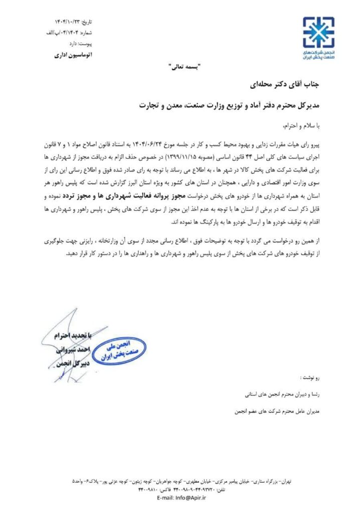 به گزارش روابط عمومی انجمن ملی صنعت پخش ایران، در پی تداوم توقیف خودروهای شرکت‌های پخش مواد غذایی توسط پلیس راهور به بهانه‌ی الزام ارائه مجوز پروانه فعالیت شهرداری‌ها و مجوز تردد در استان‌های مختلف، انجمن ملی صنعت پخش ایران با ارسال نامه‌ای به دفتر آماد و توزیع وزارت صنعت، معدن و تجارت، خواستار پیگیری این موضوع شد.